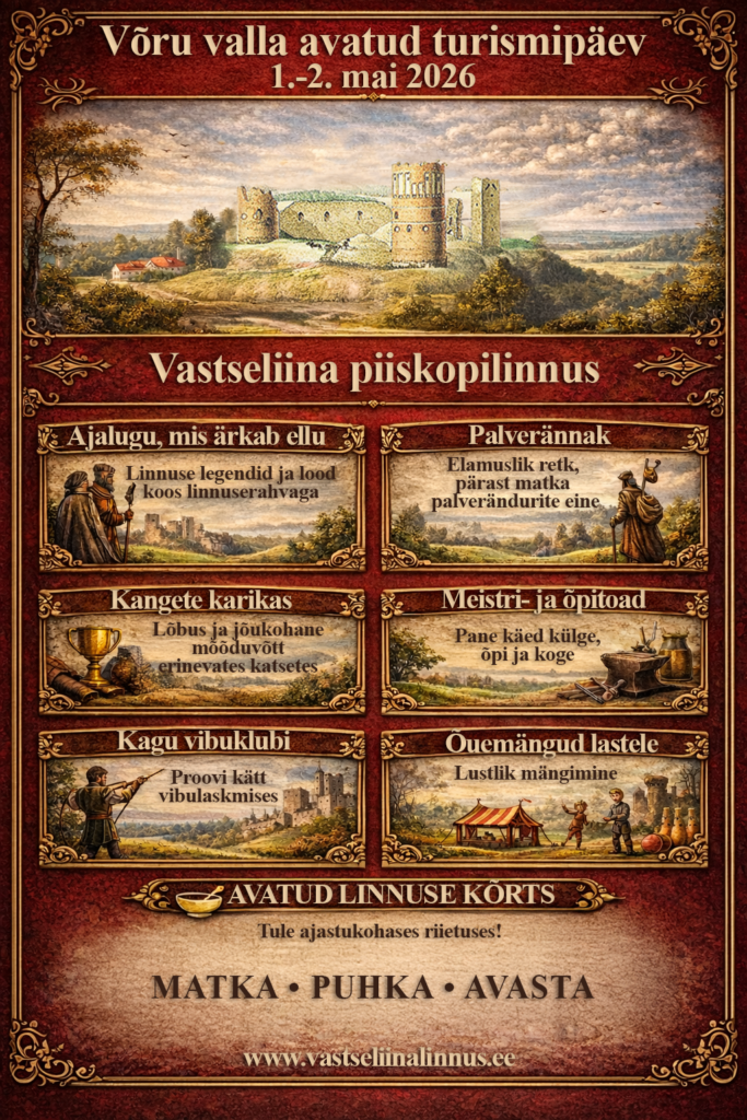 Võru valla avatud turismipäev Vastseliina piiskopilinnuses kutsub kõiki avastama Lõuna-Eesti üht salapärasemat ja ajaloolisemat paika. Kahel päeval täitub linnuseala elu, lugude ja tegevustega, mis viivad külastajad ajas tagasi ning pakuvad elamusi kõigile.